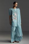 A sky blue shirt with Japanese floral embroidery, paired with a dyed sky blue trouser, and finished with a chikankari embroidered skyblue dupatta for a fresh, graceful appeal.