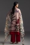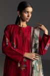 A red embroidered shirt with modern laces and chikankari details, paired with an embroidered trouser, and finished with a printed colorful floral dupatta for a vibrant, textured look.