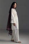 A stone white embroidered shirt with modern laces and chikankari details, paired with an embroidered trouser, and finished with a printed burnt red dupatta for a soft, elegant finish.
