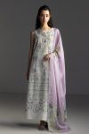 A pearl white shirt with kantha embroidery, paired with a dyed pearl white trouser, and finished with a printed lavander dupatta for a delicate, timeless elegance.