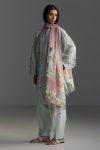 An ice blue shirt with kantha embroidery, paired with a dyed ice blue trouser, and finished with a printed tea rose pink dupatta for a serene and graceful look.
