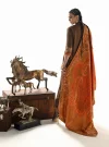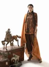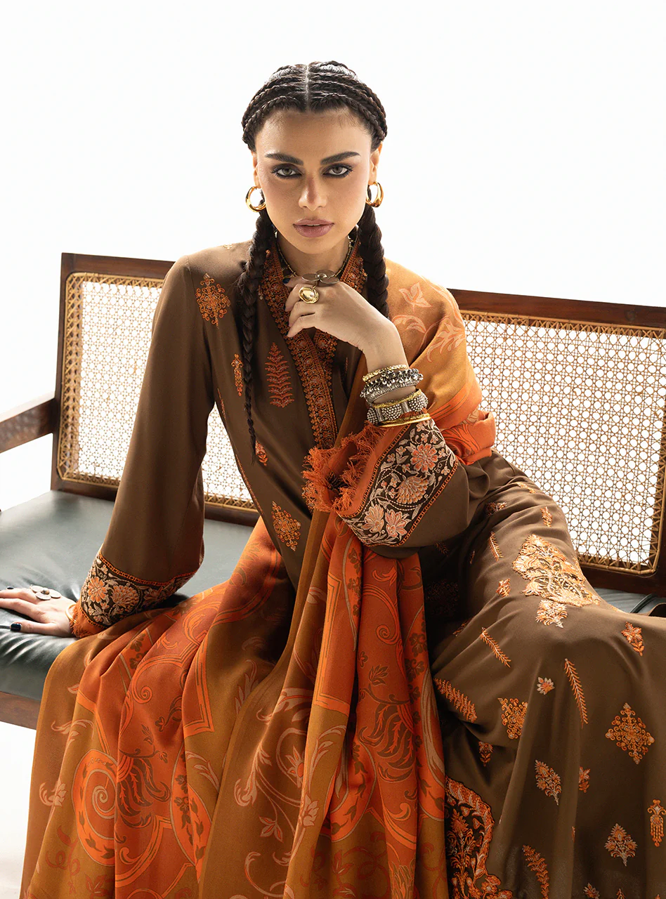 Zuri is an ode to the earth’s timeless beauty, crafted in rich, grounding tones. The deep, warm brown Marina Twill suit provides a sophisticated canvas, subtly adorned with delicate tribal-inspired embroidery on the sleeves. This subdued elegance is dramatically elevated by the exquisite Lenzing Ecovero shawl, which blooms with an intricate tapestry of patterns in vibrant oranges, deep rusts, and warm terracotta. The shawl drapes with an inviting warmth, creating a harmonious blend of understated luxury and bold artistic expression.